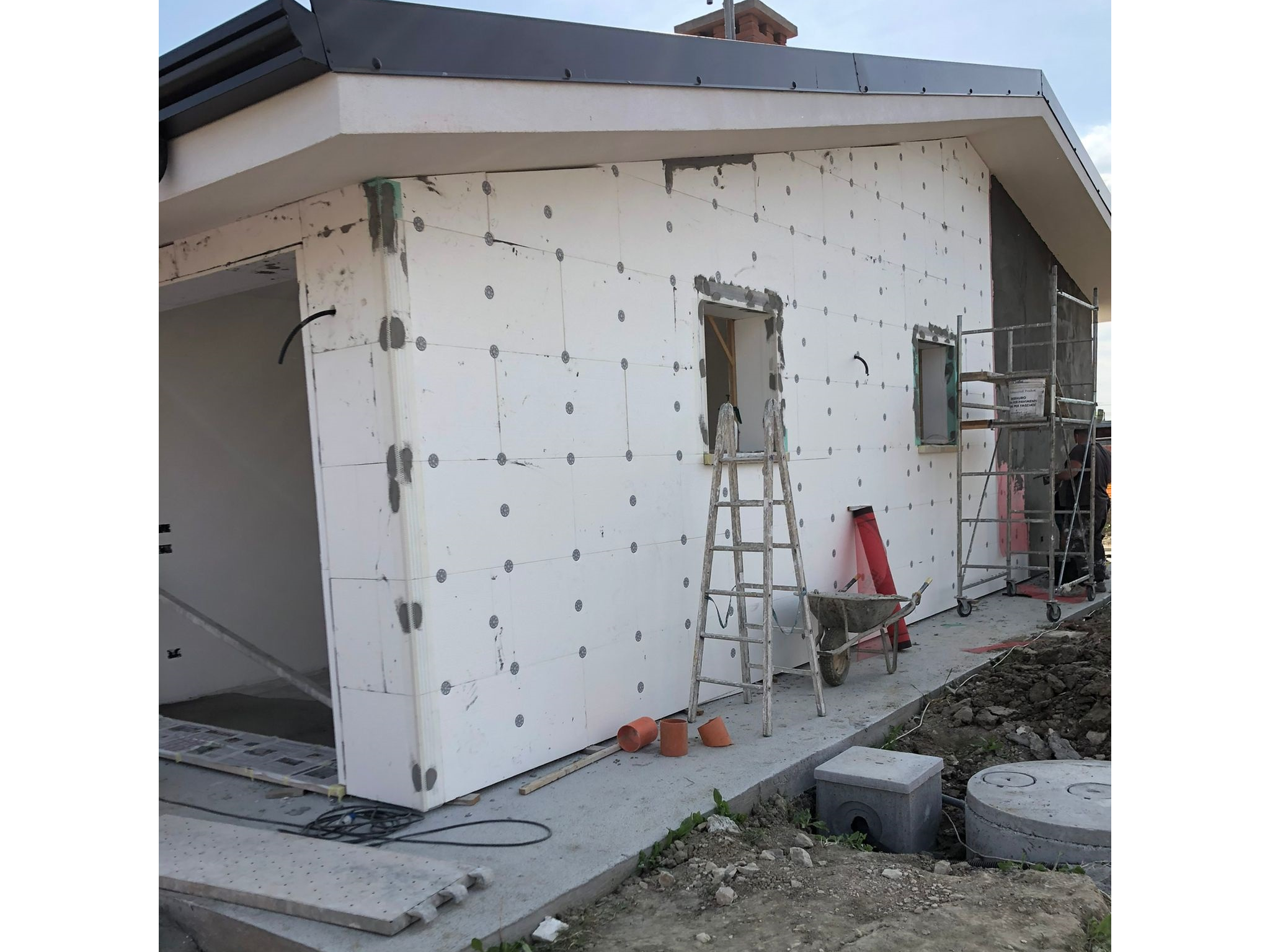 Realizzazione di cappotto esterno, finito con intonaco colorato.
